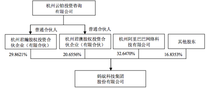 第二个持股平台杭州君澳,成立于2012年12月,是蚂蚁高管、蚂蚁员工和阿里高管的持股平台。杭州君澳目前共有 26 名合伙人,普通合伙人和执行事务合伙人为杭州云铂,有限合伙人为杭州君济及 24 名自然人,杭州君济的普通合伙人为杭州云铂,有限合伙人为14 名自然人(其中包括 5 名杭州君澳的有限合伙人)。