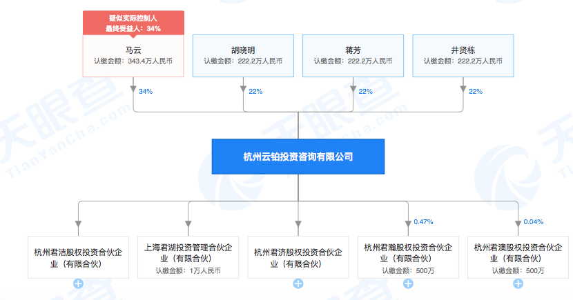 杭州云柏原本是马云100%控股的私人公司。2020年8月21日,法定代表人由马云变更为蒋芳,同日,股东由马云一人,新增了3个人,分别是胡晓明、蒋芳和井贤栋。根据相关章程及协议,在杭州云铂股东会相关决议事项上,井贤栋、胡晓明及蒋芳为马云先生的一致行动人。所以,这个股东变更,意义不大,马云依旧100%控制杭州云柏!