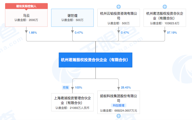 马云通过控制两个员工持股平台杭州君瀚和杭州君澳,来控制蚂蚁金服。