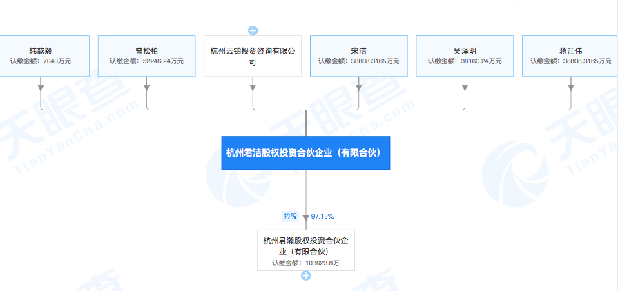 杭州君洁的5名自然人股东是韩歆毅、曾松柏、宋洁、吴泽明和蒋江伟。韩歆毅是蚂蚁金服副总裁,持股是最少的,大概4%,其余四位都是阿里巴巴的合伙人成员。