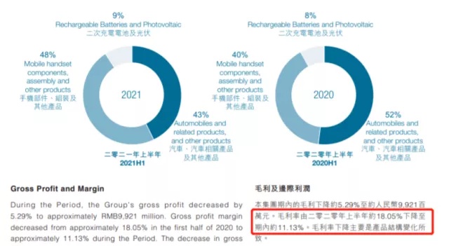 细分类看三大业务分别占总收入的42.80%、48.04%和8.83%。汽车、汽车相关产品及其他产品的占比有不小的缩小(去年同期52%),手机部件、组装及其他产品的占比则从40涨至如今的48%。