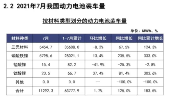 今年以来,磷酸铁锂电池备受终端青睐,7月我国动力电池装车量11.3GWh,同比上升125.0%,环比上升1.7%。其中三元电池共计装车5.5GWh,同比上升67.5%,环比下降8.2%;磷酸铁锂电池共计装车5.8GWh,同比上升235.5%,环比上升13.4%。